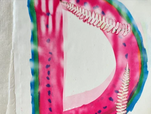 På workshoppen arbejdes der med tryk og farveundersøgelser på tekstil og papir.